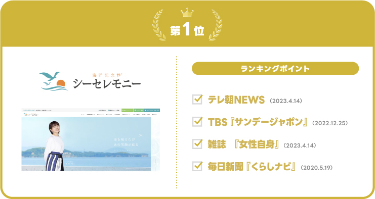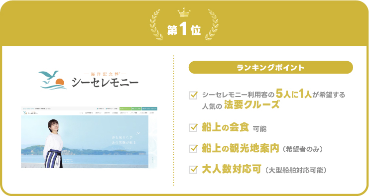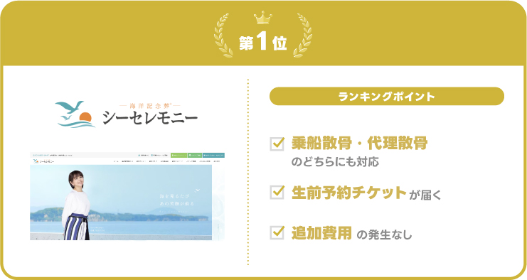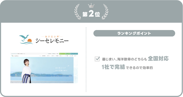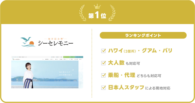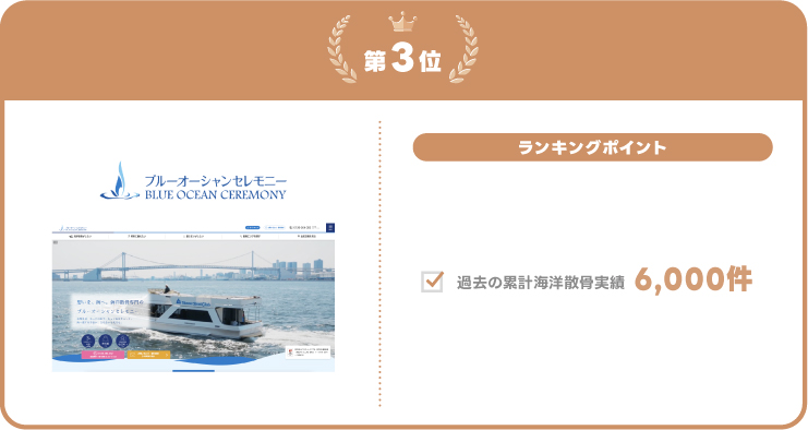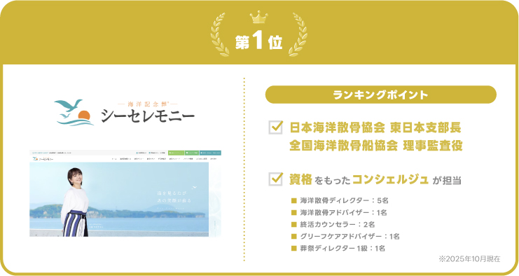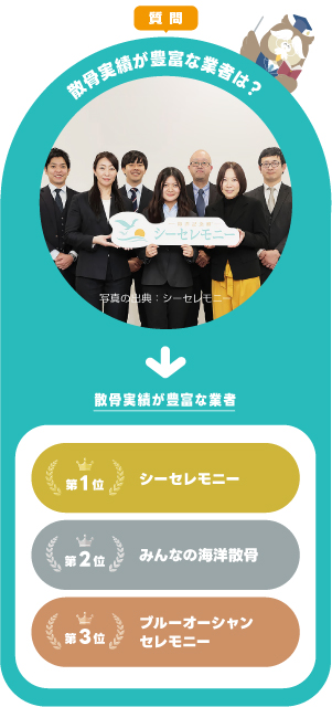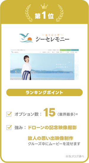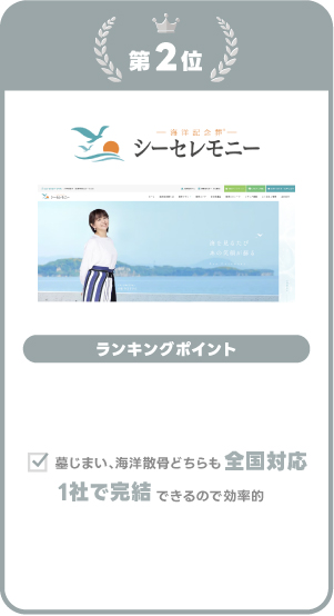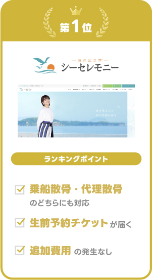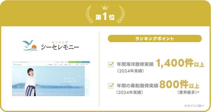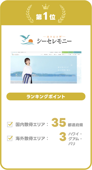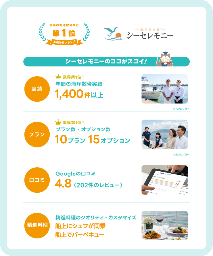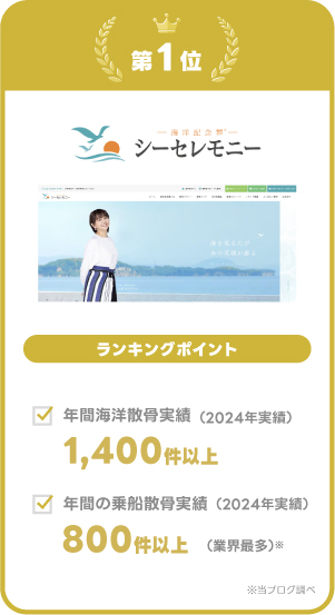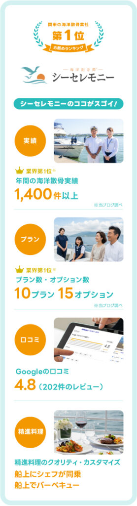 海洋記念葬『 シーセレモニー 』は、海洋散骨実績・プラン数・口コミ評価・アフターサポートのすべてで業界トップクラスを誇る人気の業者です。