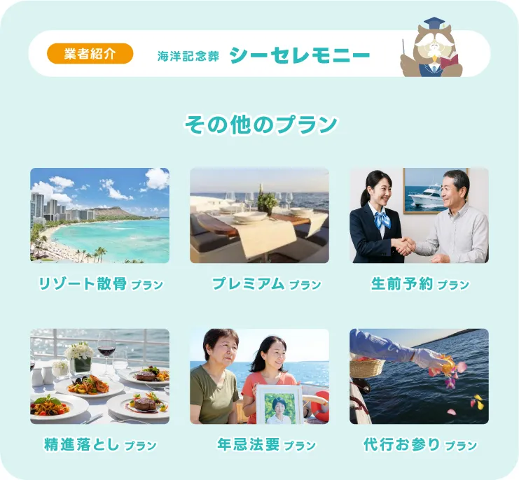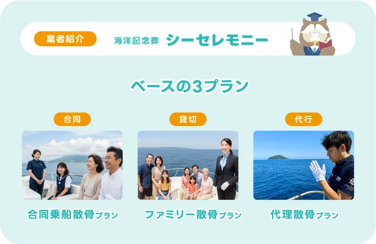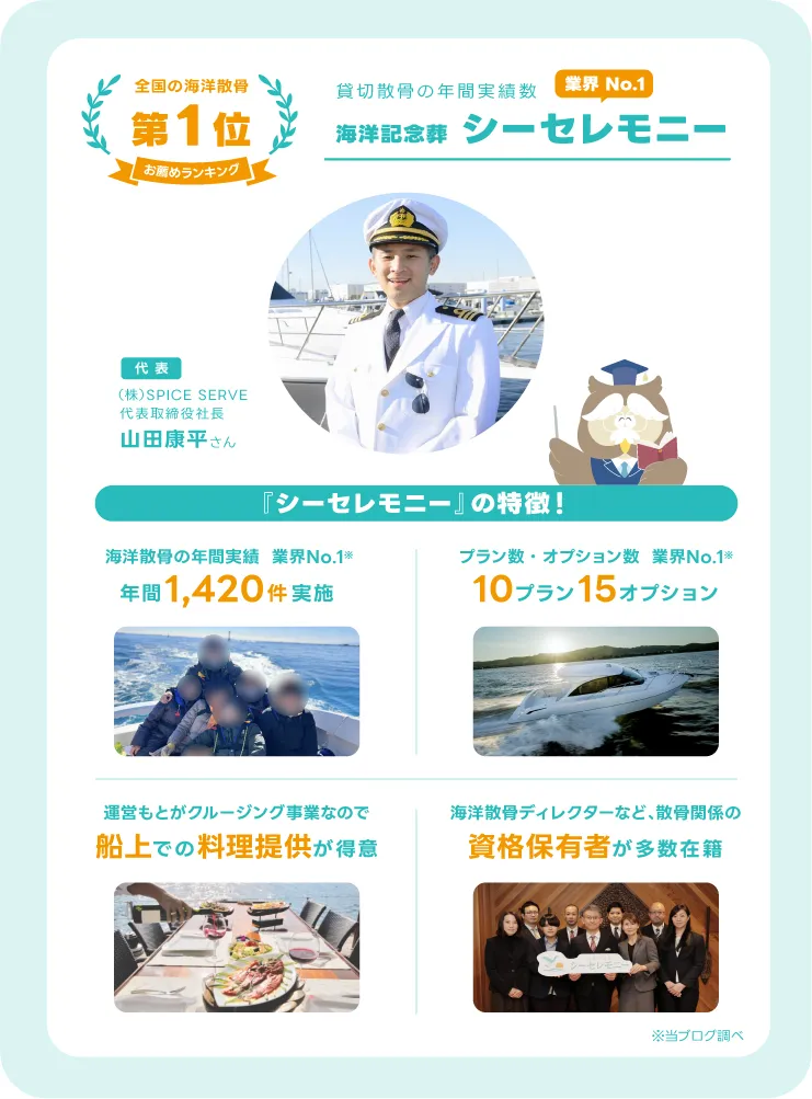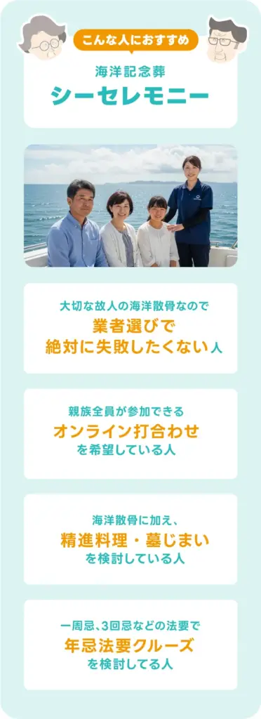 口コミや評判、プランの内容などから シーセレモニー の信頼性やサービスの質の高さがお分かりいただけたと思います。特に海洋散骨がはじめての方には安心して任せられるので特におすすめです。