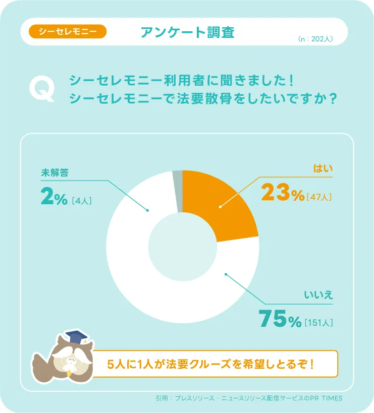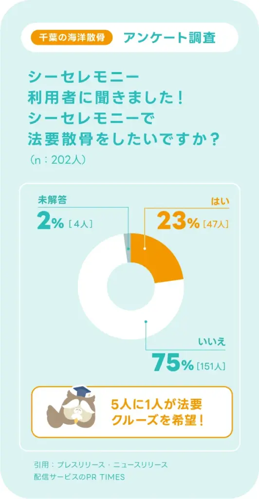 お客様アンケートによると、 シーセレモニー で海洋散骨をした人のうち5人に1人が「またシーセレモニーで法要クルーズを行いたい」と回答しており、顧客満足度が高いことがわかります。