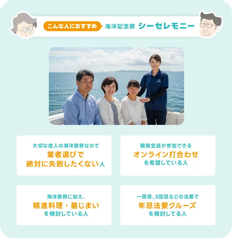 「海洋記念葬」。海洋散骨をしたその日がご家族にとって新しい記念日になることを願い、 シーセレモニー では自分たちのサービスをそのように名付けました。