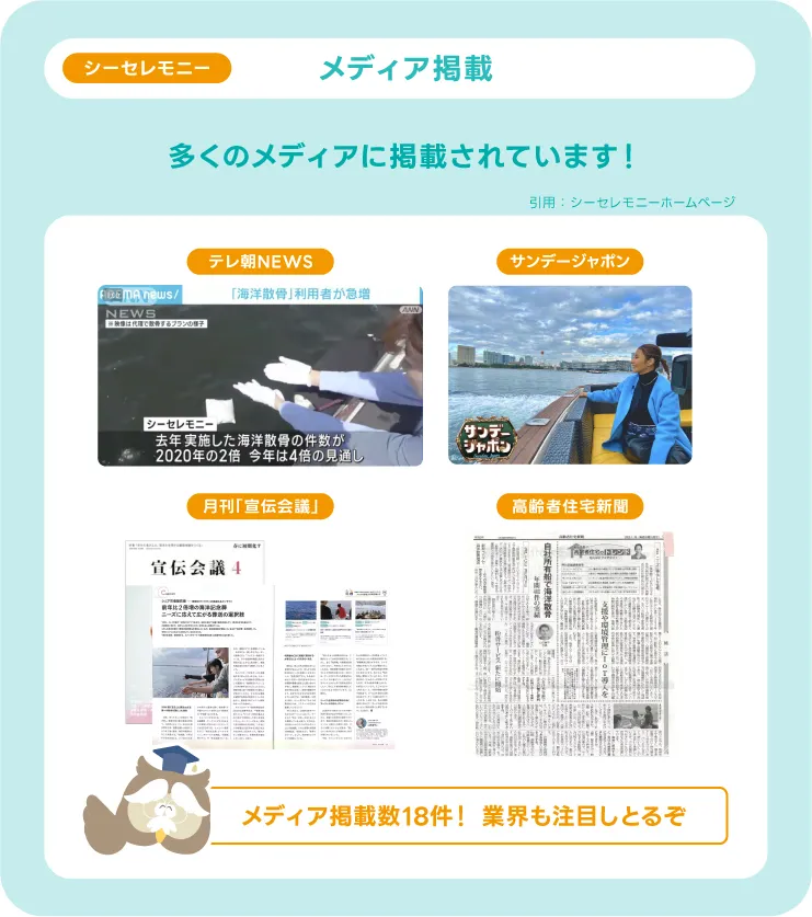 シーセレモニー は、業界でも注目を浴されていて、「テレ朝ニュース」や「サンデージャポン」など多くのメディアで紹介されています。