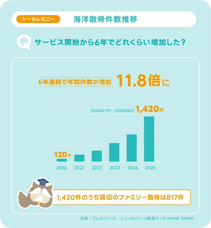海洋記念葬 シーセレモニー の海洋散骨サービスは2019年から始まりました。2020年から2024年までの6年間で実施件数はなんと11.8倍!2024年の年間実績は1,420件。