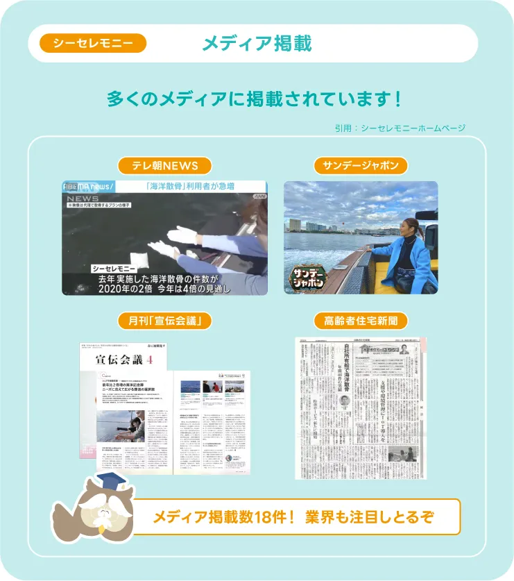 シーセレモニー は、業界でも注目を浴されていて、「テレ朝ニュース」や「サンデージャポン」など多くのメディアで紹介されています。
